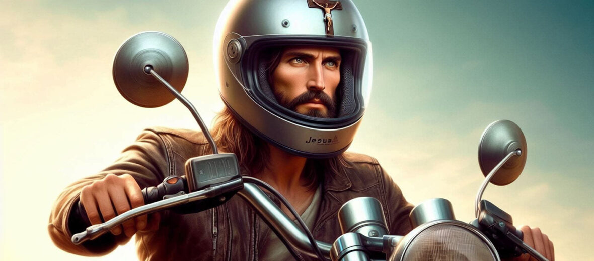 In the roar of engines and the scent of petrol, Jesus1 rides forth once more. His leather clad form is crowned by a silver helmet, a sacred shield2 against the wind’s fury. And on that helmet a cross gleams, catching the sun’s rays like a beacon of hope.